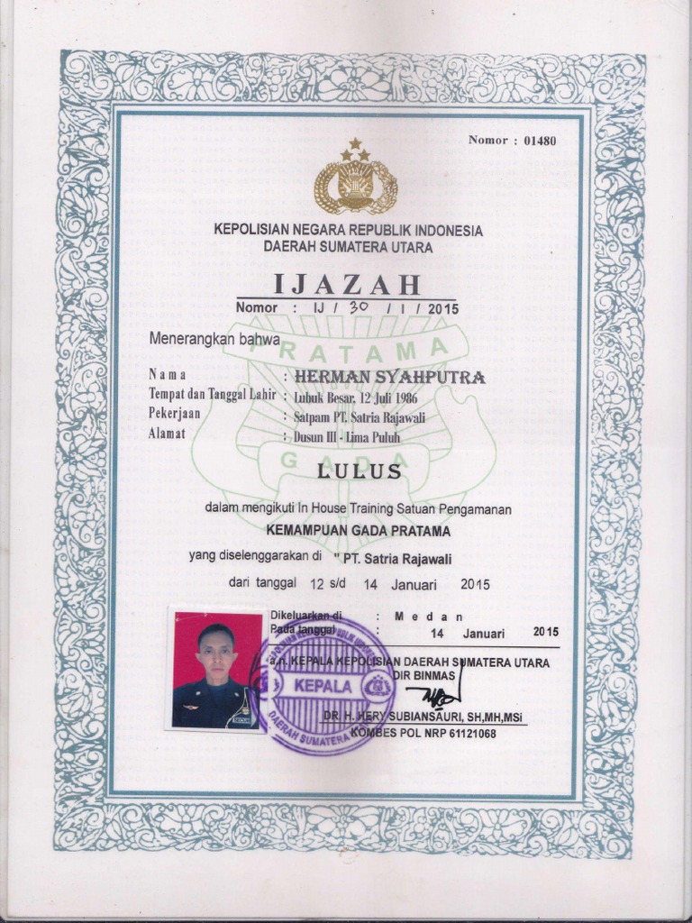 Penyedia sekaligus pemalsu ijazah jasa satuan pengamanan atau satpam, di bongkar kepolisian polda jatim. Semoga selalu baik baik saja ya. Nomor ijazah biasanya berisi no/nomor/nomor ijazah/nomor seri ijazah. Untuk tingkat satuan pendidikan apa?smp/sd?sma kl no seri ijazah adanya paling bawah yg di cetak bolong2 biasanya kl ga yg tulisan (d1.) nomer pengeluaran ijazah dr sekolah paling atas contoh. Biaya penerbitan kta dan ijazah untuk profesi satpam sudah diatur dalam peraturan pemerintah nomor 60 tahun 2016 tentang jenis dan tarif atas jenis penerimaan negara bukan pajak yang.